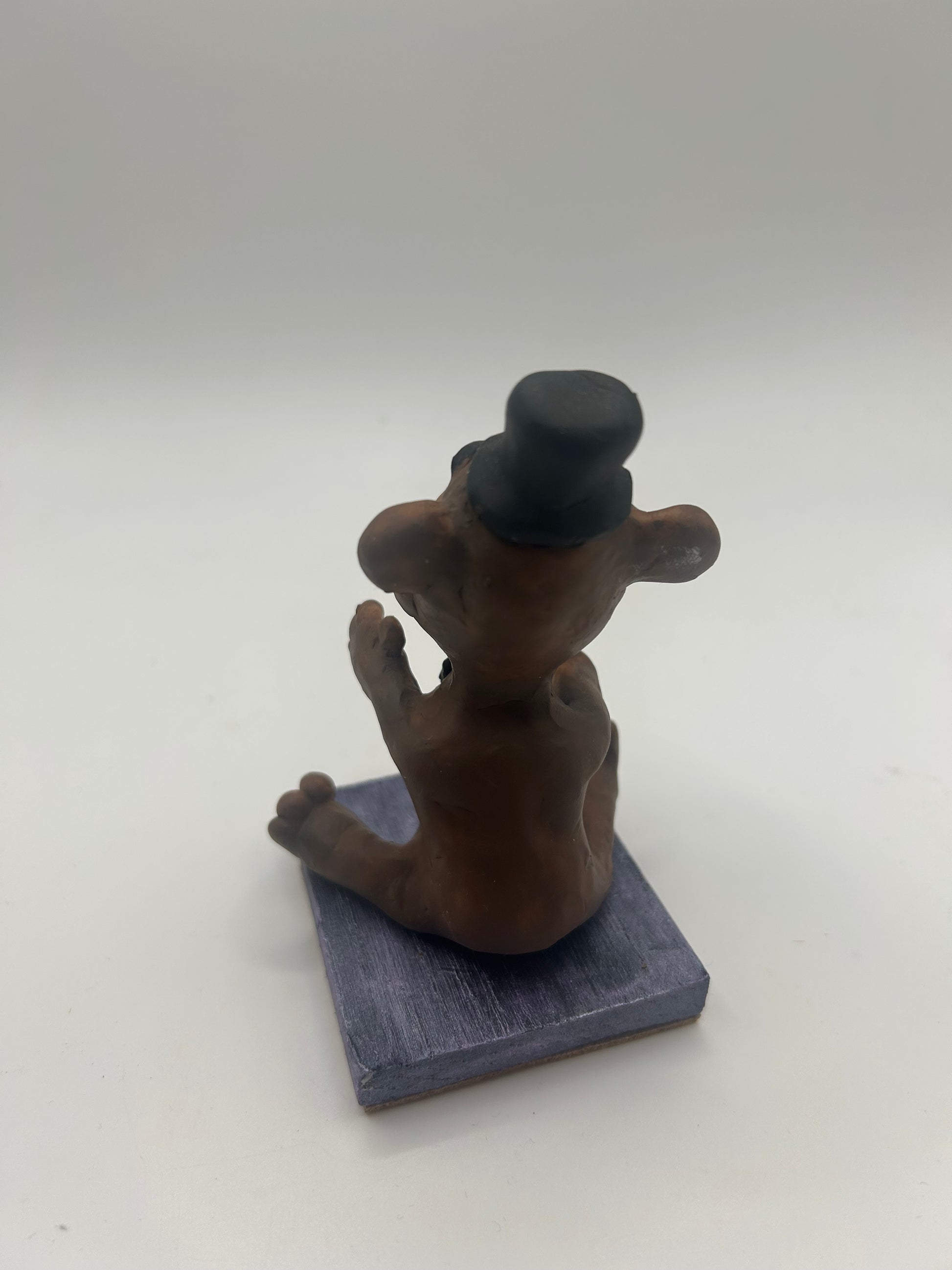 Hand-sculpted with polymer clay and mounted on a wood base, this little bear brings a playful twist to any room.